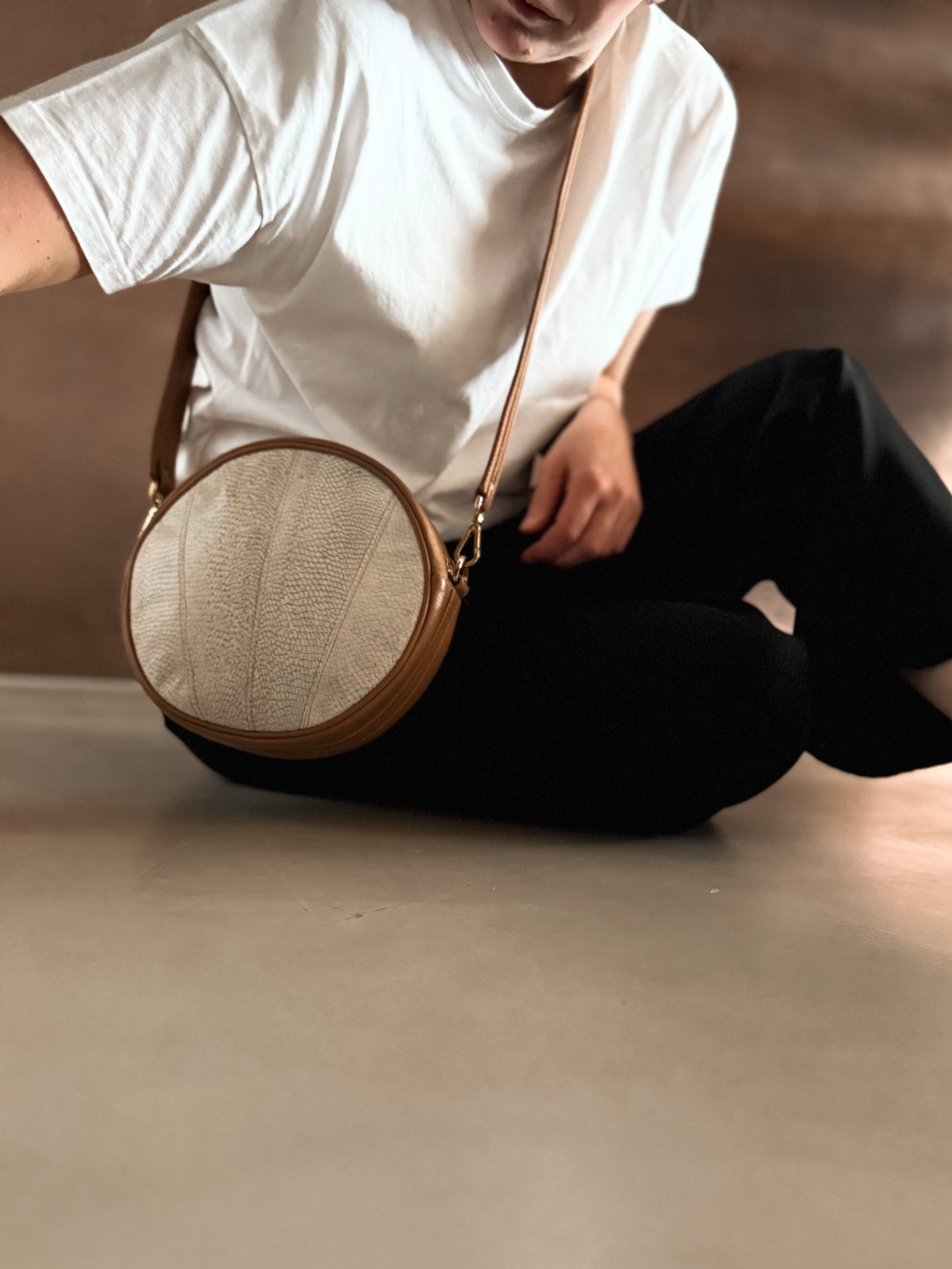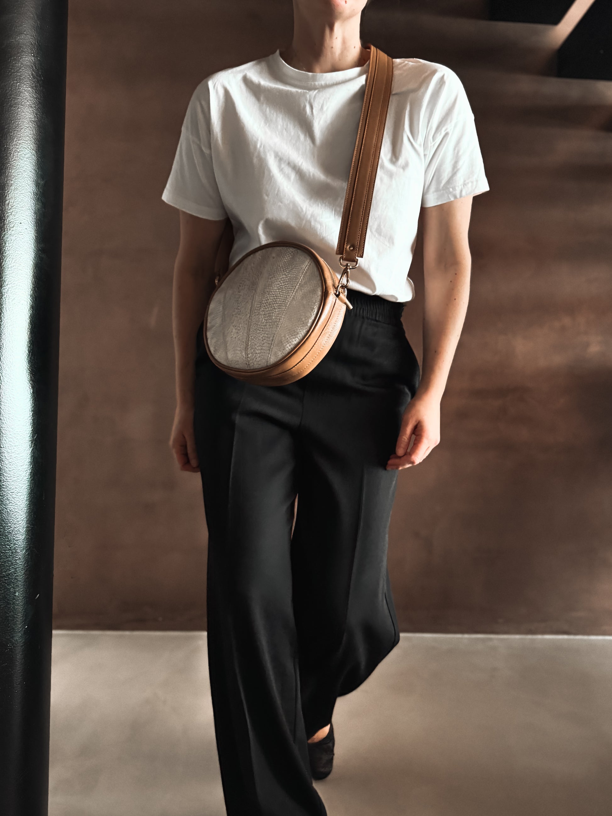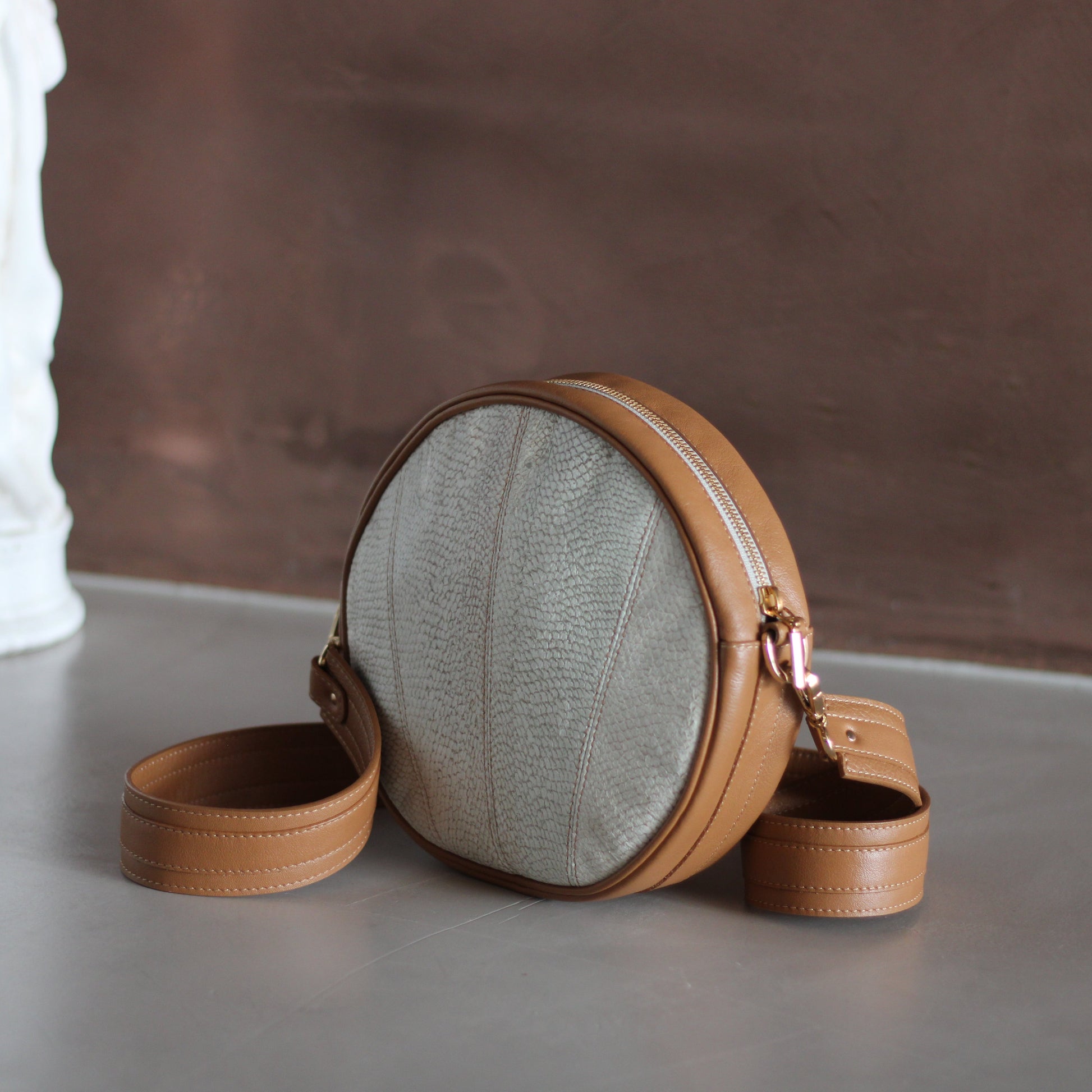 Leikkisä Billy-laukku hurmaa pyöreällä muodollaan ja Viona Blun klassikko nahkahihnallaan. Billy-laukku on valmistettu käsityönä Suomessa pehmeästä lohen- ja lehmännahasta. Laukku suljetaan vetoketjulla ja sen sisältä löytyy nahkainen pikkutasku.
