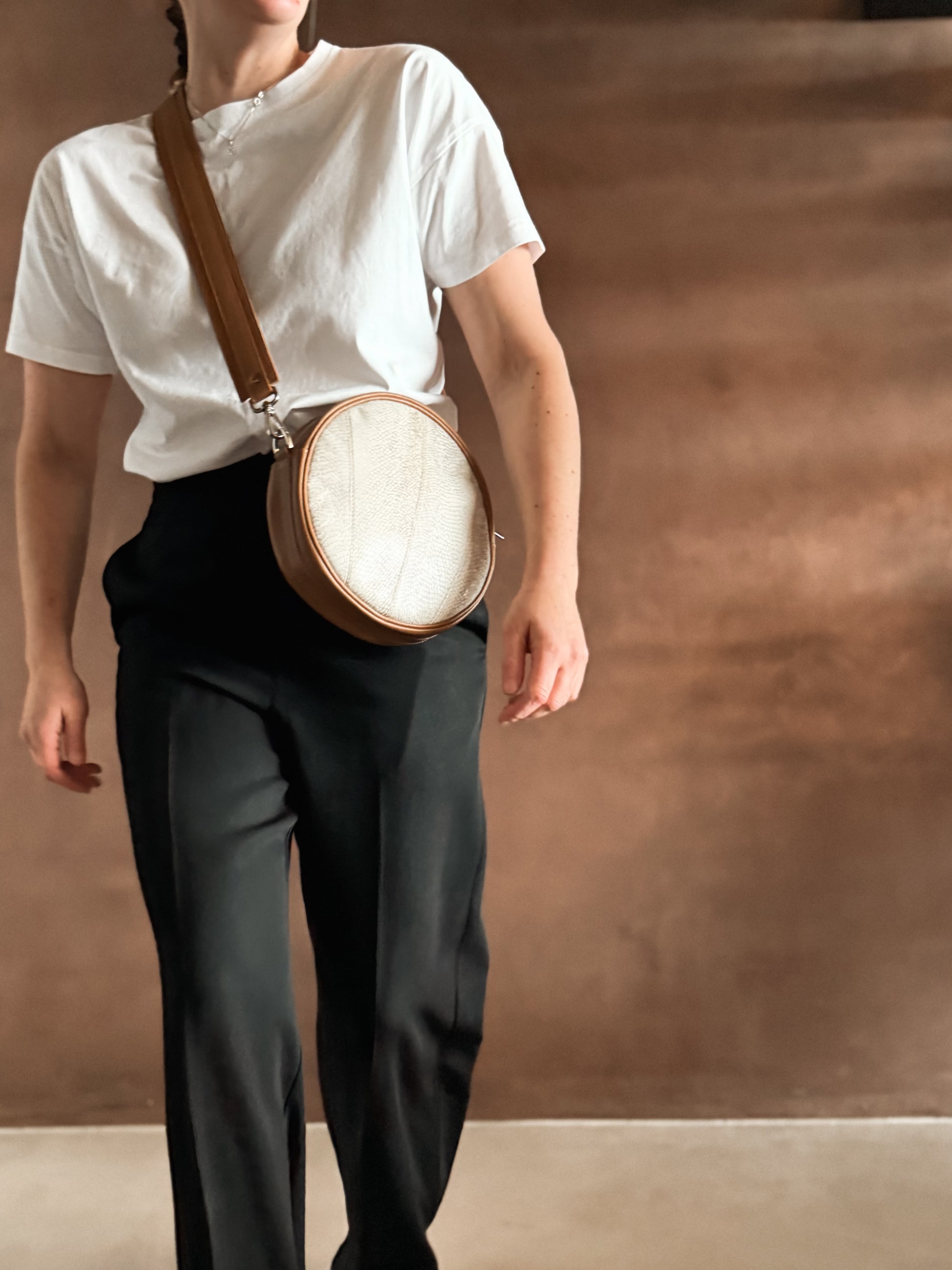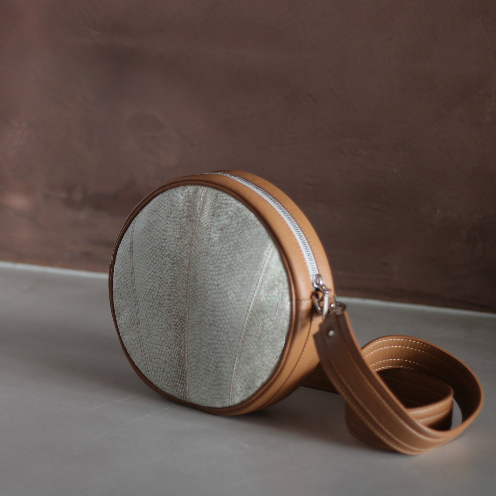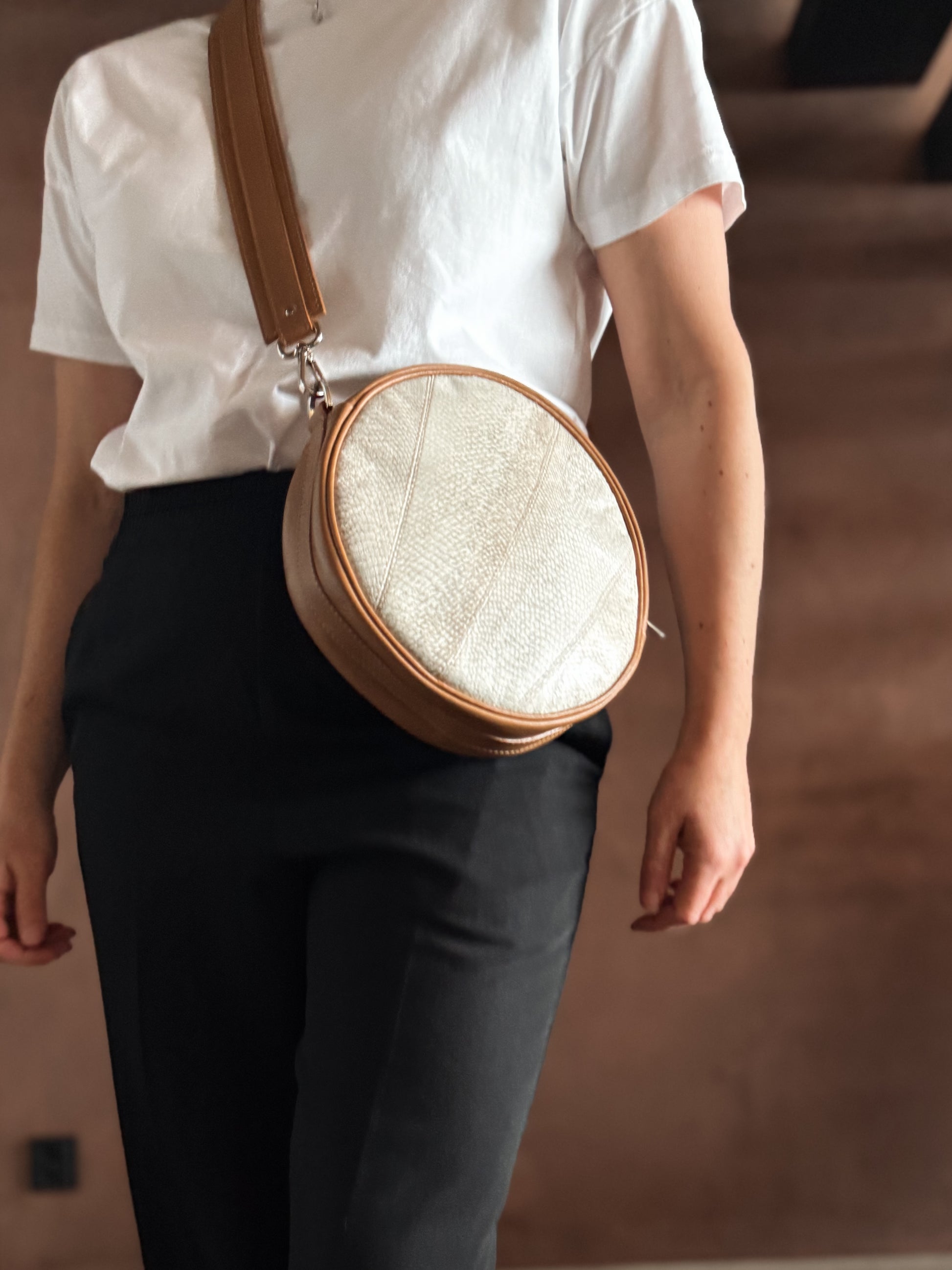 Leikkisä Billy-laukku hurmaa pyöreällä muodollaan ja Viona Blun klassikko nahkahihnallaan. Billy-laukku on valmistettu käsityönä Suomessa pehmeästä lohen- ja lehmännahasta. Laukku suljetaan vetoketjulla ja sen sisältä löytyy nahkainen pikkutasku.