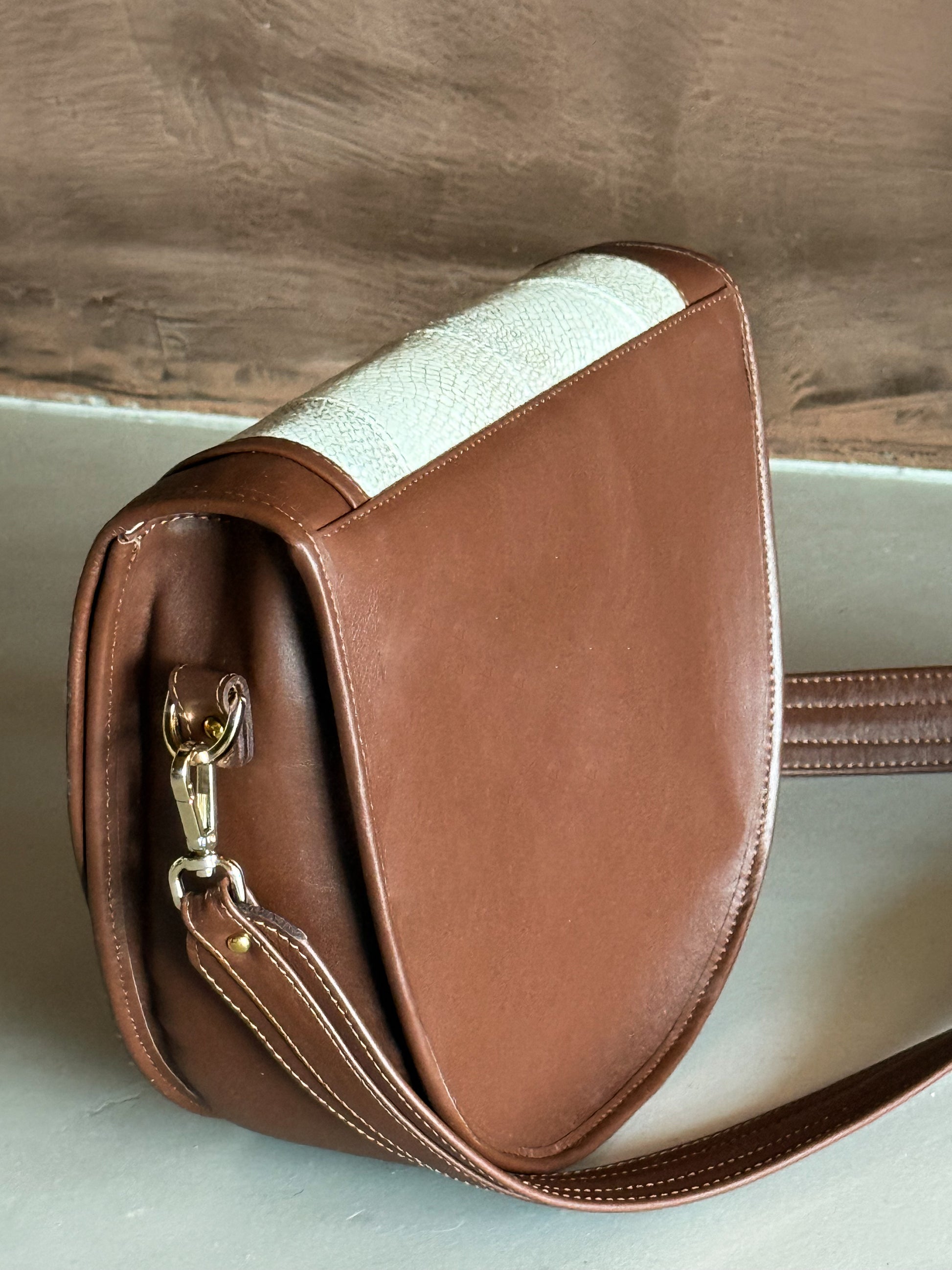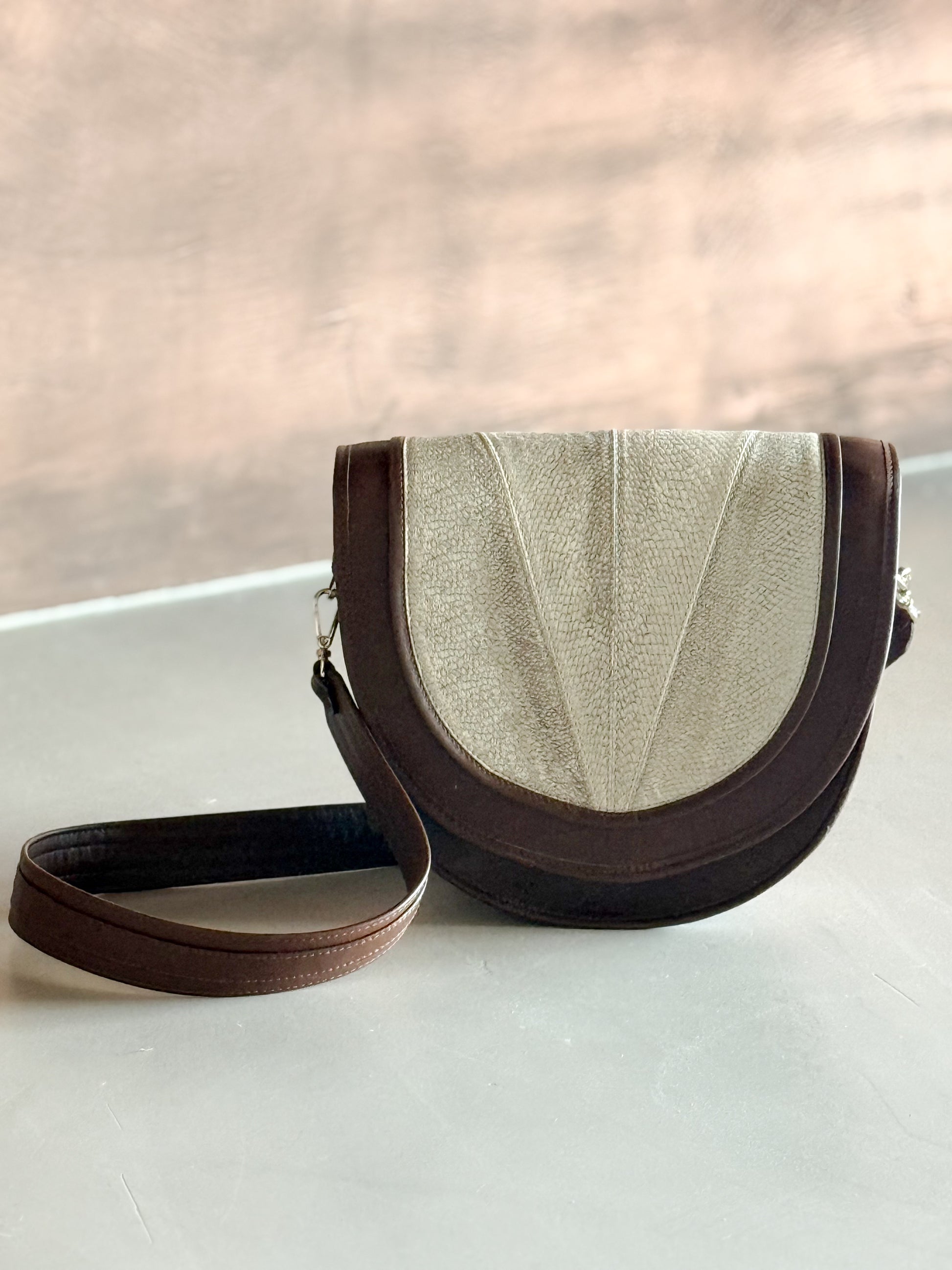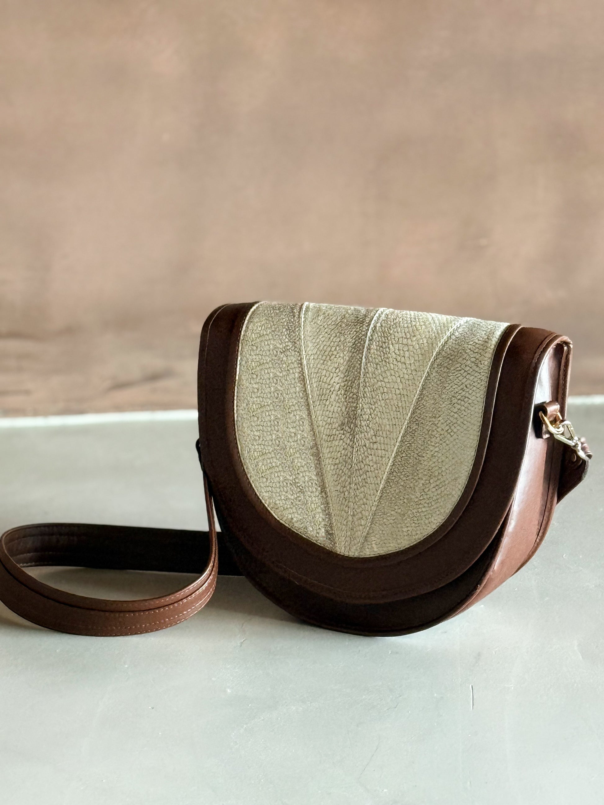 Tämä käytännöllinen crossbody- laukku on valmistettu korkealaatuisesta kalannahasta ja pehmeästä naudannahasta, jotka yhdessä luovat kestävän ja tyylikkään kokonaisuuden. Laukku on tilava ja monikäyttöinen, sopien moneen eri tilanteeseen. Sisäpuolella on kauniisti viimeistelty lehmännahkavuori ja metallit ovat Italiassa valmistettuja samakista, nämä takaavat pitkäikäisyyden ja kestävyyden.