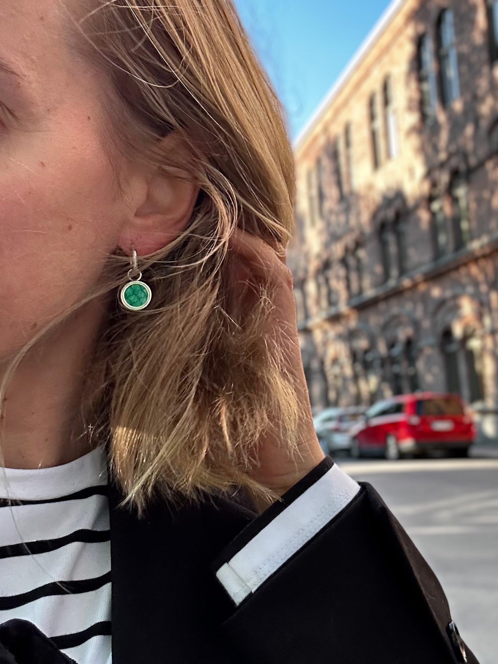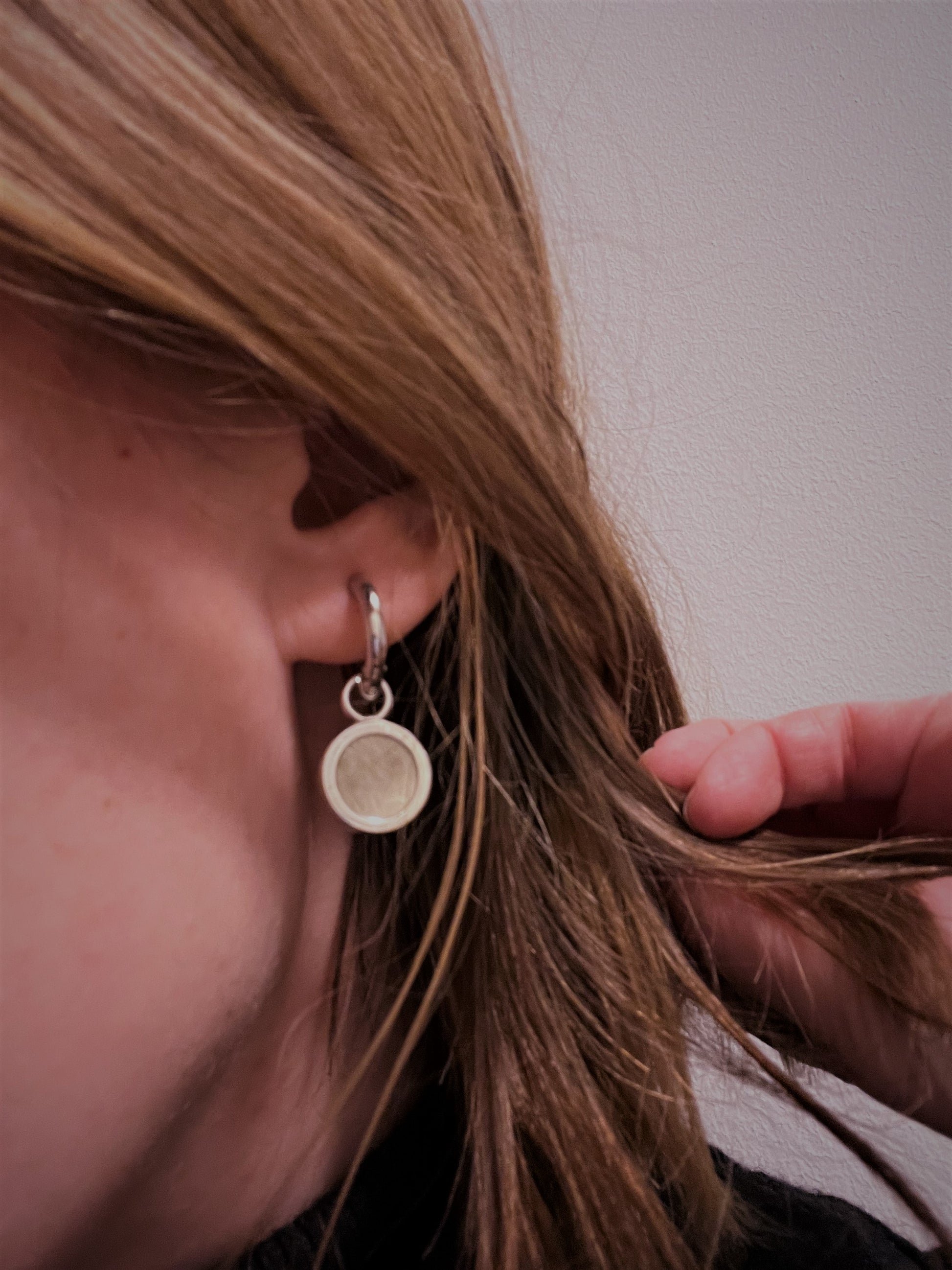Korvakorujen mitat: korkeus 3 cm, riipuksen halkaisija 1 cm.