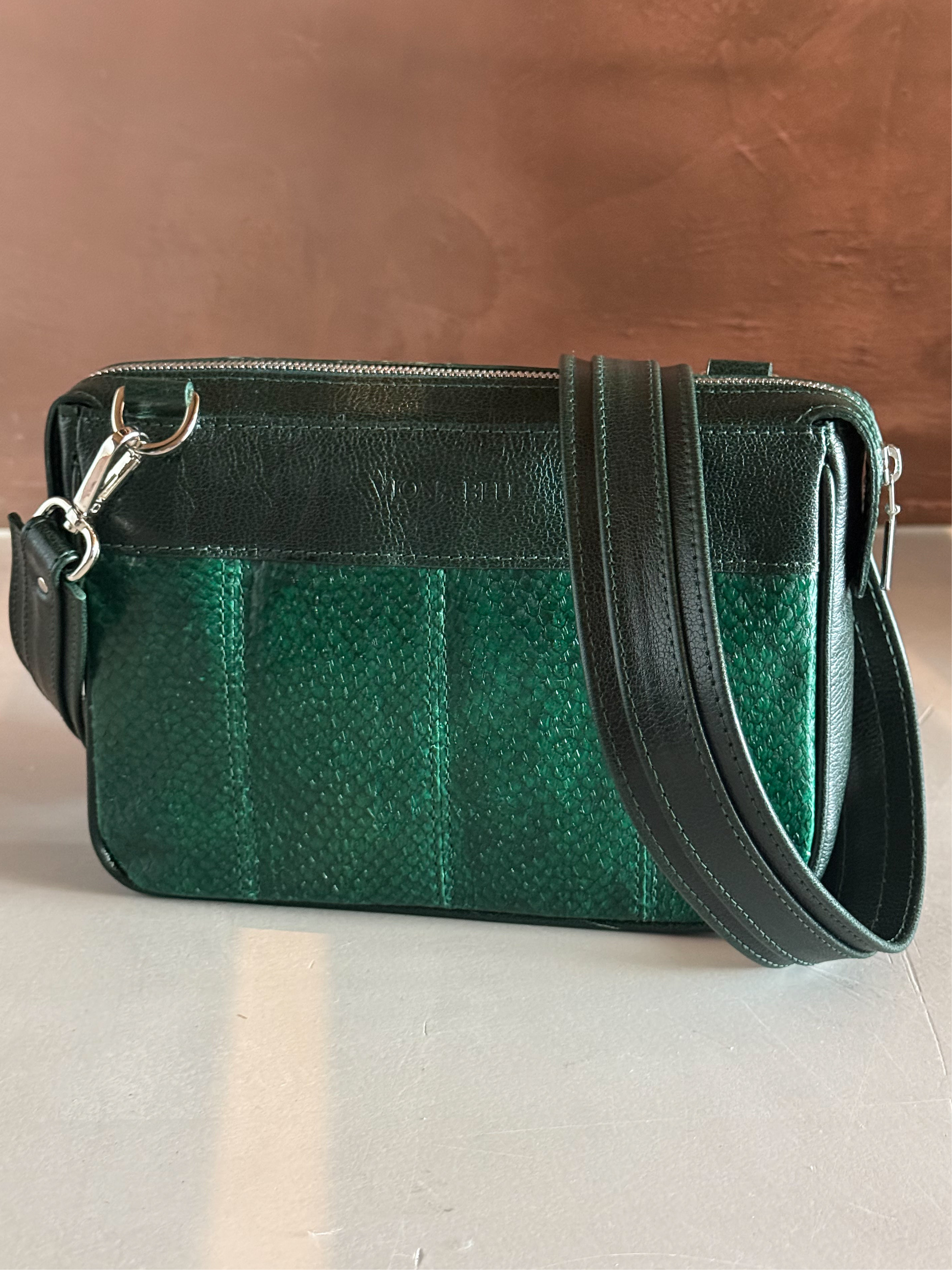 Maggie is a reliable partner for everyday use –the bag completes every outfit and fits all your essentials in. Maggie is handmade in Finland from beautiful salmon and cow leather. The lining is durable fabric which is made out of recycled bottles. The bag is closed with a metal zipper and there is a small pocket inside.