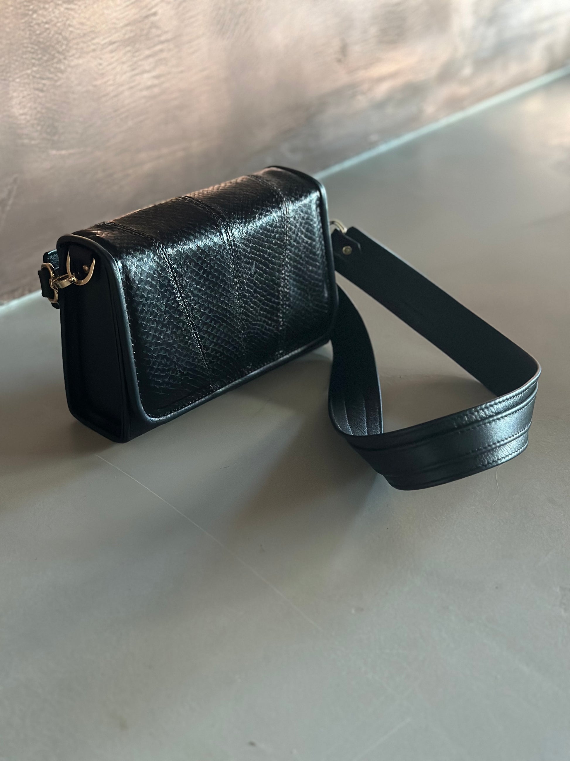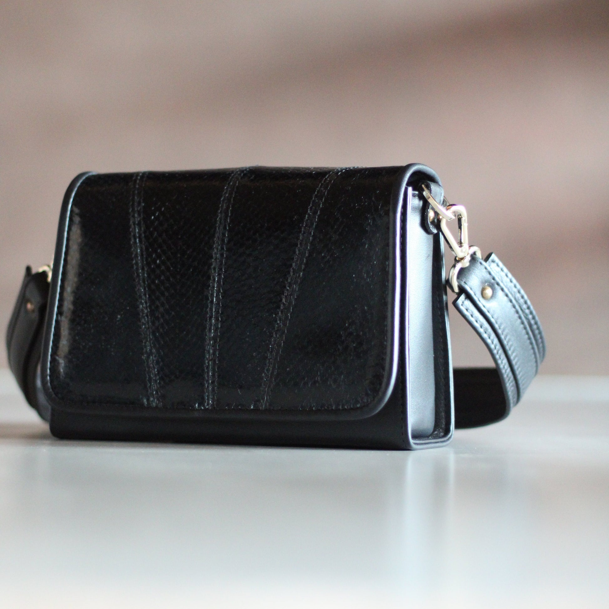 Versatile V-bag has been designed in collaboration with Finnish stylist and model Maryam Razavi. V-bag is an attractive companion for everyday use, from day to night – it can be carried on a leather strap on the shoulder, in a metal chain or as a clutch. V-bag is handmade in Finland from soft salmon and cow leather. The bag has a durable metal button locking and a small pocket.